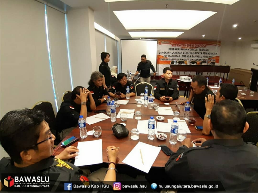 Banjarmasin, Badan Pengawas Pemilihan Umum Kabupaten Hulu Sungai Utara – Bawaslu Provinsi Kalimantan Selatan menyelenggarakan Rapat Koordinasi Pembahasan dan Diskusi tentang Langkah-langkah Strategis Upaya Peningkatan Elektabilitas Lembaga bersama Bawaslu Kabupaten/Kota Se-Kalsel, Jumat (01/11/2019), di Hotel Zuri Express Banjarmasin.