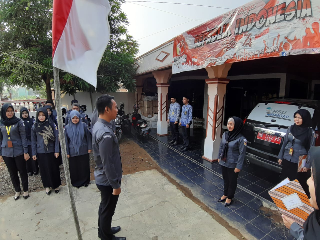 Amuntai, Badan Pengawas Pemilihan Umum - "Pancasila Sebagai dasar Penguatan karakter Bangsa Menuju Indonesia Maju dan Bahagia" yang merupakan tema hari kesaktian Pancasila. Selasa (1/10/2019) bertempat di halaman Bawaslu kabupaten Hulu Sungai Utara telah melaksanakan upacara peringatan hari kesaktian pancasila, yang mana hal ini melaksanakan sesuai intruksi surat edaran Bawaslu RI Nomor: 0295/BAWASLU/SJ/HM.03.00/IX/2019 Tentang Upacara Peringatan Hari Kesaktian Pancasila.